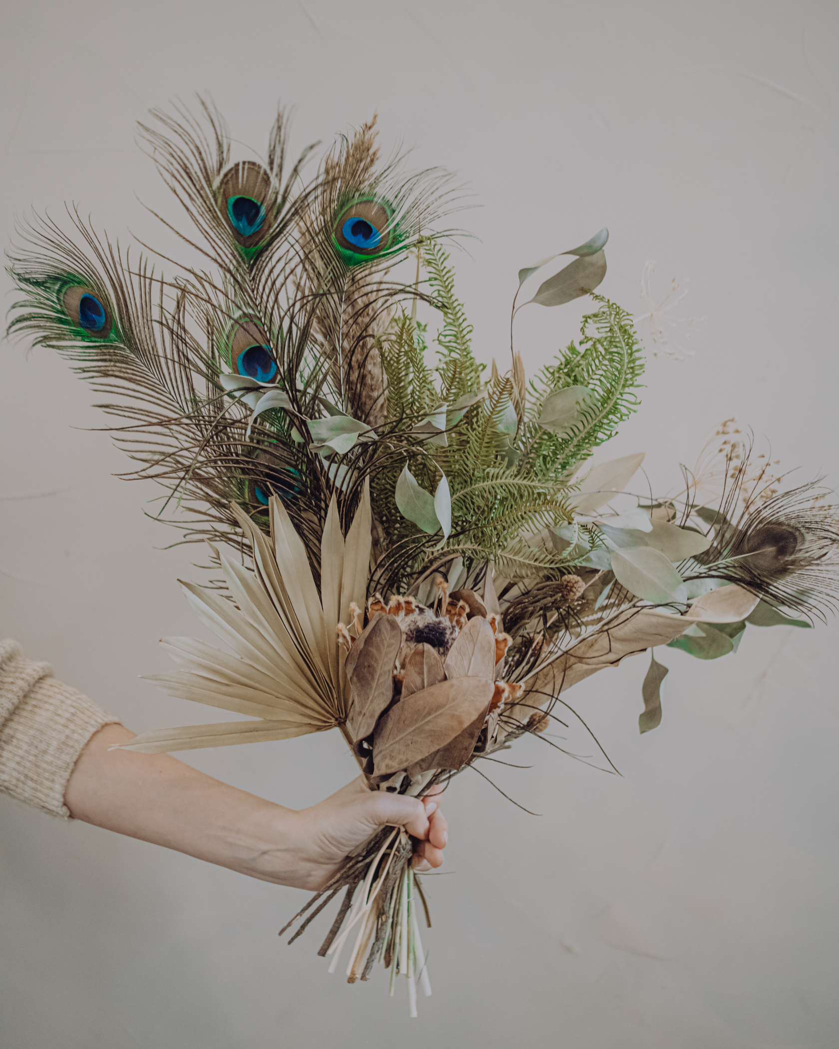 Généreux bouquet de fleurs séchées sauvage, composé de fougère, protéa séché, plumes de paon, feuille de palme…